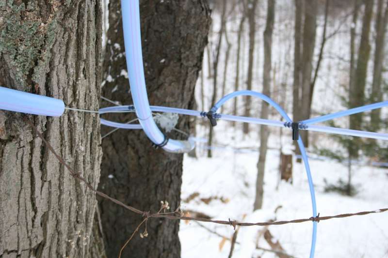 The crews repair the lines by splicing in new pieces of plastic, which can take a good deal of time with as many lines as Patterson Farms has. Then, the crew begins to tap the trees, one at a time, with a battery powered drill that drives the plastic spiles just about 3/8-inch into the tree. The holes must be re-tapped into a new part of the tree every year, as the bark grows over the old hole (the trees are not damaged). Once all of the lines are repaired, the Patterson Farms team can keep an eye on their condition with a video surveillance system they’ve installed across their properties.