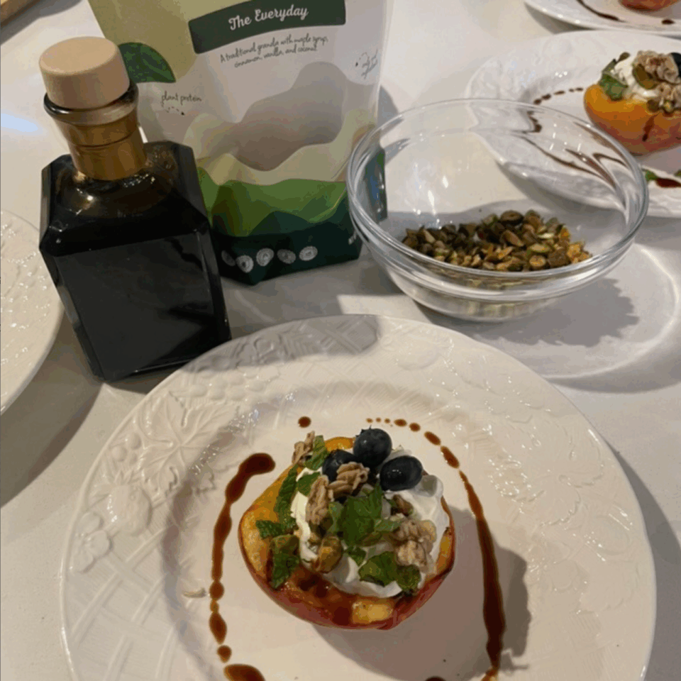Grilled peaches with blueberries, mascarpone cream, mint, The Everyday granola, and balsamic glaze