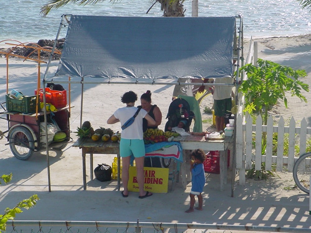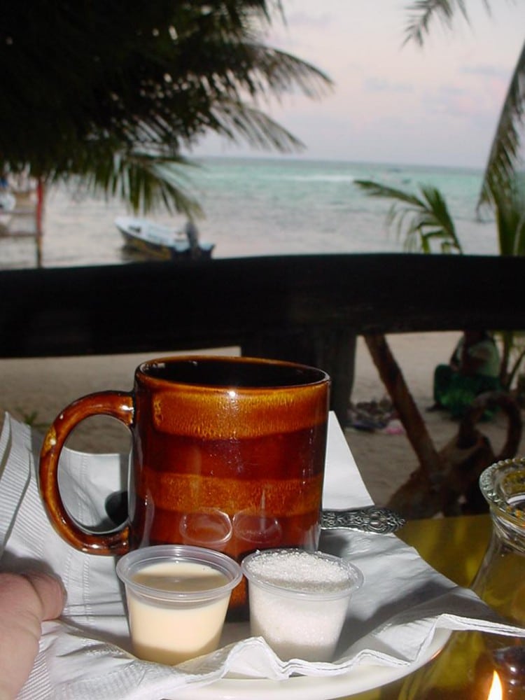 P.P. and I checked  out and took  our packs to a beach front cafe where I munched on fresh fruit  (peeled fruit of course as I have etched in my mind a sentence from my guide book “Peel it, cook it, boil it or vom-it”- yikes!) and coffee. I had read about fry jacks but to experience one hot from the fryer with fresh pineapple preserves and salty butter was remarkable. The coffee, however, is not so remarkable.Â