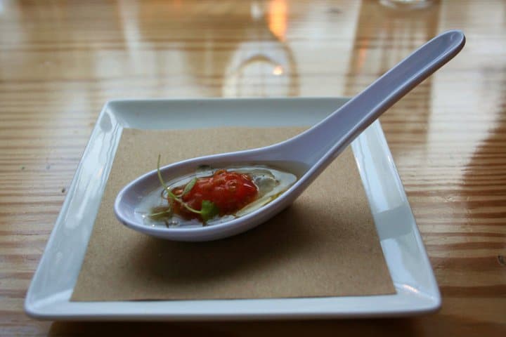 The first of the seven Exit beers to come out was a large glass of Exit 11 Hoppy American Wheat. The glass was filled to the brim and presented enough beer to function both as cocktail and appetizer, which it had to do as it was the only unpaired beer of the night. Soon after, our next beer came out, which was the Exit 1 Bayshore Oyster Stout. It was paired with a Cape May salt oyster with spiced tomato granita and micro celery. The slight saltiness of the oyster stout paired perfectly with the briny oyster, which was contrasted nicely with the spicy tomato mixture.