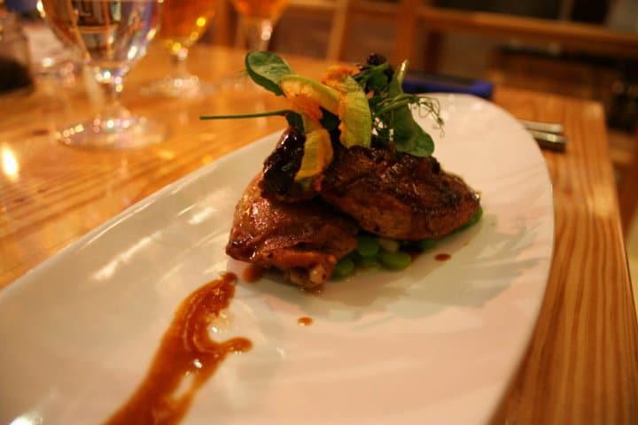 Our next courses were paired with the Exit 16 Wild Rice Double IPA and the Exit 9 Hoppy Scarlet Ale, respectively. Following a low note with petite portions of Barnegat light soft shell crab, everyone happily dug in to our fifth course of fire-roasted Griggstown poussin with spring bean ragout, squash blossom and scarlet chicken jus.