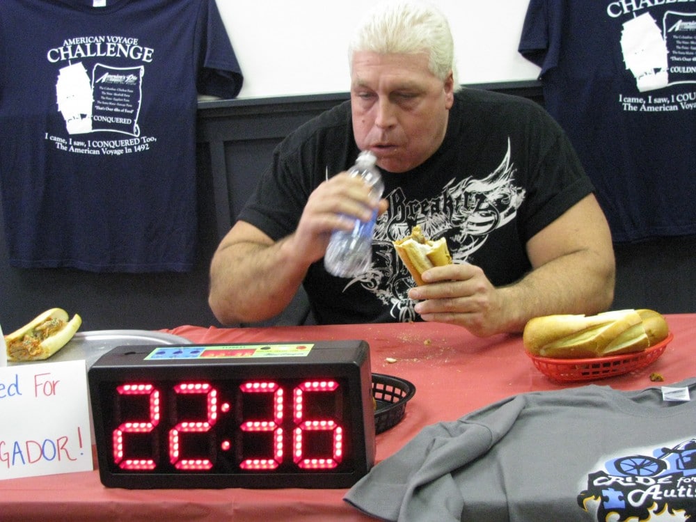 Before the countdown began, El Wingador separated the tray of four sandwiches into four baskets, to help him mentally prepare for the challenge. Bill kept his friends, including “Deadliest Catch” star Russ Newberry, on the sidelines to offer words of encouragement while he took down each sandwich. His friends described him as a guy who is always giving back, whether donating to the VFW, Ride for Autism or being a spokesperson for Autism in his Woodbury Heights hometown.