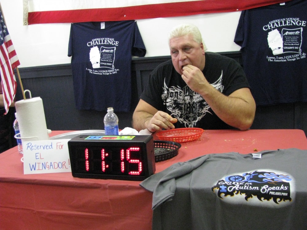 In the three months since they’ve cooked up this challenge only two people have attempted the “American Voyage” and both hit a wall less than halfway through. That’s when America’s Pie owners decided to call in a professional, Bill “El Wingador” Simmons, the five-time Wing Bowl Champion.