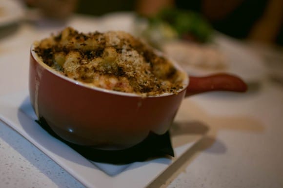 Baked Lobster Mac + Cheese crafted with lobster-cognac cream, mascarpone, asiago and parmigiano-reggiano.