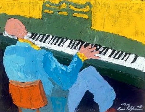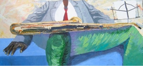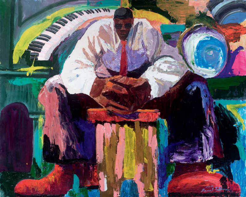 More surprising was the content of his character. He possesses a deep love and passion for all that is close to his heart. A family man, he realized while working for his father at a young age that he didn’t want the “9 to 5 thing.” He had his mind set on being an artist. Come what may, he was going to support his wife and two children through the brilliance of his brush. With a pallet of styles and colors, he set out to capture his family and heritage on canvas. After mastering realism, he had reached a state of boredom. Pushing himself to do better and fueled by his passion for happiness, he broke free with an elongated Cubism inspired folk art. Tilghmanʼs totally fantastic style can capture blues players and Negro baseball players and present them to the everyday common man.