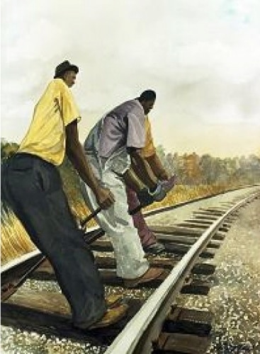 Itʼs mostly from black and white photography. I either go online to the Library of Congress website or Iʼve even gone down to the Library of Congress. They have a lot of black and white photographic books. I just flip through until something feels right. Thatʼs my thought process; it has to feel good. Then you start to put the picture together, because sometimes a painting will have three or four different references. A little bit from here and a little bit from there, so you are building a story. Sometimes a photo will tell a whole story but you arenʼt using all of the elements in the photo. Now Iʼm doing it in my elongated style.