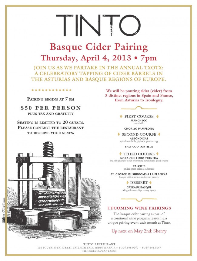 Join Tinto on Thursday, April 4, beginning at 7 p.m. for a Basque Cider Pairing Dinner!