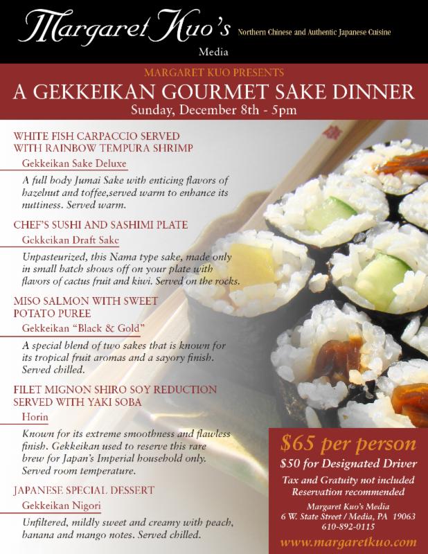 Sake, sushi, salmon and steak…how delicious does that sound? Have it all—and more—at Margaret Kuo Media‘s Gekkeikan Gourmet Sake Dinner, scheduled for Sunday, December 8, at 5 p.m.!