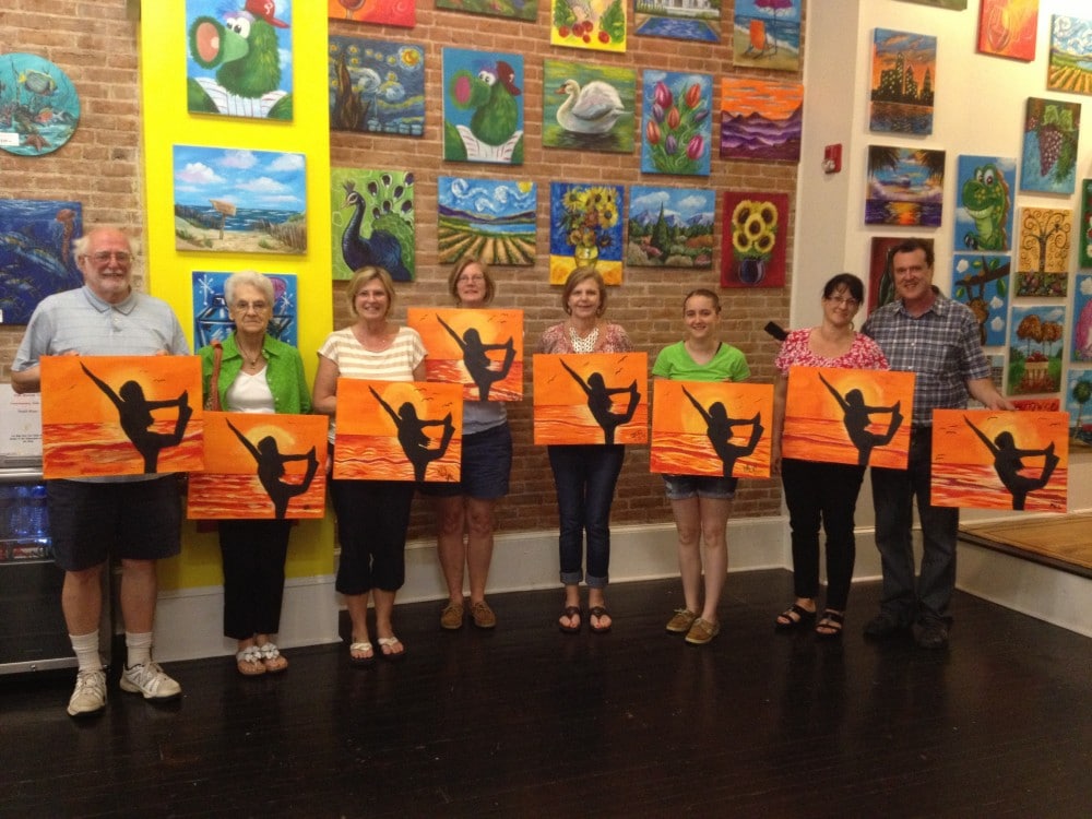 The Spirited Artist is now Phoenixville’s BYOB & Paint! Help the studio celebrate its new name with a special class on Sunday, July 21. Starting at noon, professional yoga instructor Elizabeth McGrath will teach a 45-minute level 1 Yoga class in the studio, which will be followed by a 2-hour painting session. Create your very own work of art, “Yoga Beach.” Don’t think you can create a gorgeous work of art? Check out this photo of a previous group and their masterpieces: