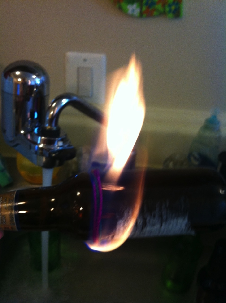 Hold the bottle horizontally over your sink full of water and carefully light the yarn. Keeping your hands at either end of the bottle, slowly rotate so the flame burns evenly. Use caution when attempting this step and never move away from your sink!