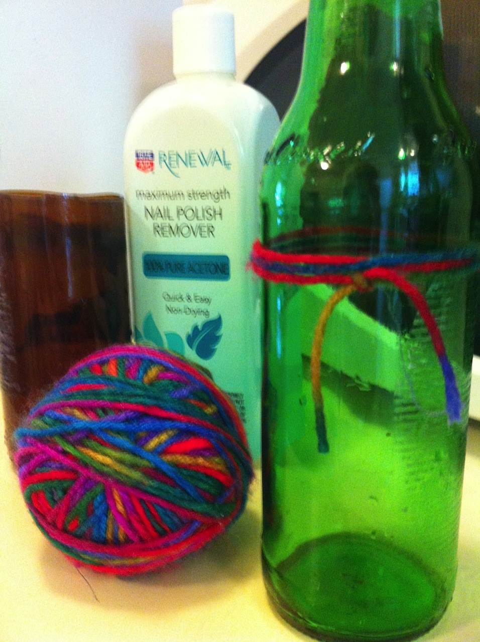 Wrap your yarn around a bottle three or four times. Cut and tie so the yarn fits the bottle snugly. Next you’ll need to slip the yarn off the bottle and soak in acetone. While you’re doing this you should fill your sink with ice water.