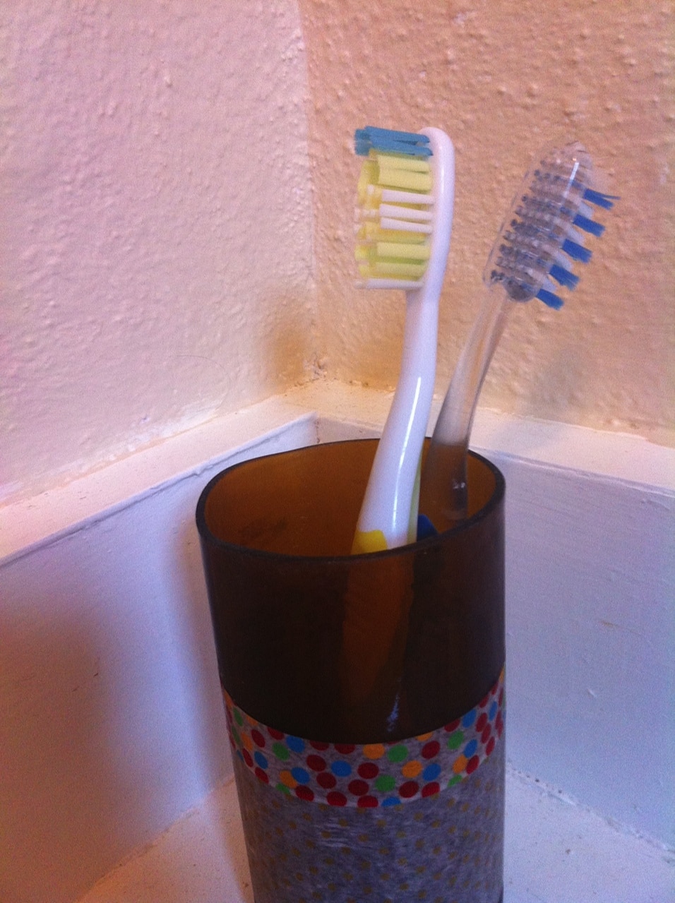 Decorate! I took the label off my bottle, but if you leave it on you might want to coat the bottle in a thin layer of Modge Podge to keep your label intact. I decided to turn the Yuengling bottle into a toothbrush holder. Using Washi tape and Modge Podge, I added a cute polka dot trim to my glass. The other cups I made will be turned into a fun little set of glasses that I can use as a present or housewarming gift. In addition to glasses, you could make anything from tea lights to soy sauce bowls. Get creative!