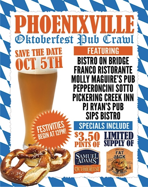 Starting at noon, Molly Maguire’s Pub, Pepperoncini Sotto, Bistro on Bridge, Franco’s Ristorante, Pickering Creek Inn, PJ Ryan’s Pub and Sips Bistro will all be offering Oktoberfest food and drink specials. On tap: $3.50 pints of Sam Adams Oktoberfest and Fat Jack, pumpkin ales from other breweries, 64-ounce Boots of Sam Adams’ Oktoberfest and more. Follow the Pub Crawl Facebook page here for up-to-the-minute info.