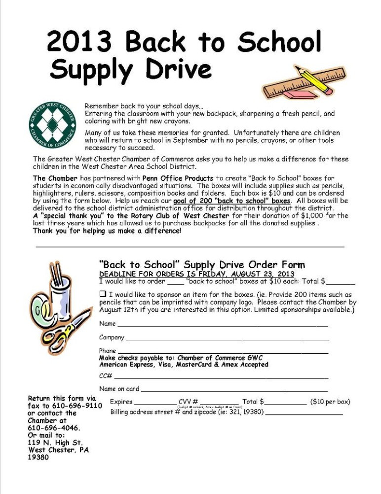 The Greater West Chester Chamber of Commerce‘s 2013 Back to School Supply Drive is well underway with today (August 23) being the last day to lock in your donation. For just a $10 donation, the local chamber will provide a back-to-school box for a disadvantaged child living in the West Chester Area School District.