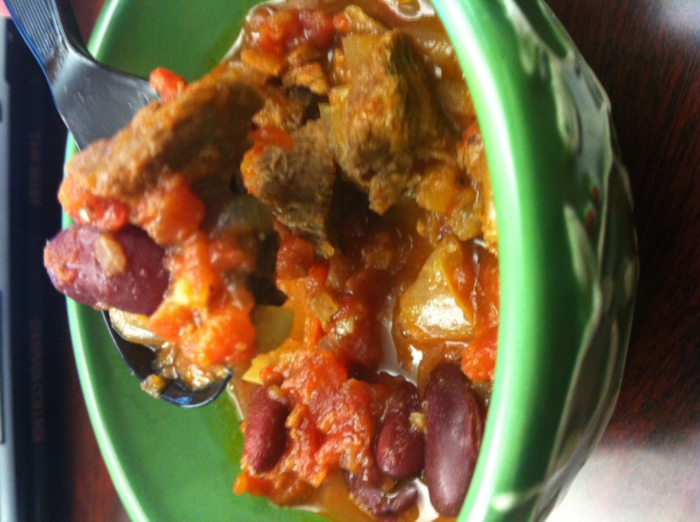 By the time I was ready to add the tomatoes my apartment was filled with a delicious (and meaty) smell. Two large cans of tomatoes and hearty helpings of cumin and coriander later, this was starting to look more like the chili I love. Deciding to get a little funky, I also added small amounts of liquid smoke and soy sauce to the pot. My stomach was really rumbling by this point so I made myself a snack while the mixture simmered for a couple hours. Before I took the chili off the stove I added two cans of beans—arguably my favorite part of the whole mess.