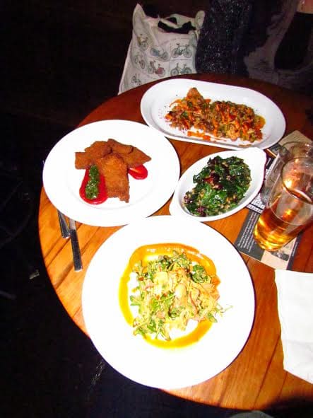 We tried four plates. The Spicy Sautéed Greens were our favorite: light (in the absence of the bacon fat I’ve come to expect with Philly greens) yet flavorfully spiced with a perfect slow burn. The Spanish Octo with Fresh Chorizo was surprisingly tender. The citrus paprika dressing on the warm Smoked Duck was very tasty. The Fried Beef Chips–a house favorite–made for a nice snack and a great way to try tongue for the first time. We were told on multiple occasions that the Pierogies are a must-have, however I think next round for me will be Octopus on a stick or Hash Brown and Smoked Cheese from the happy hour (HH) list. Dinner dishes run between $6 and $13, and additional HH choices are between $2.50 and $5.