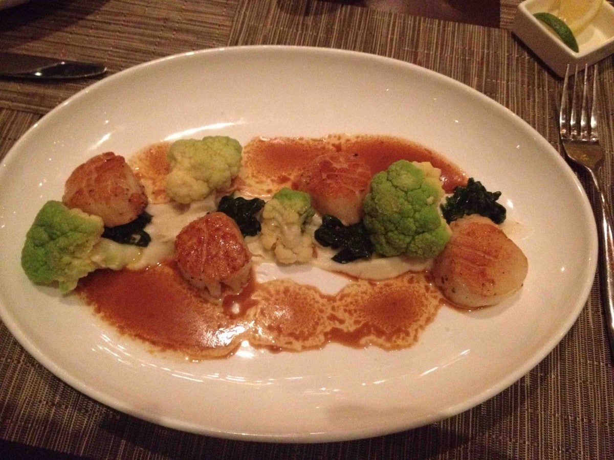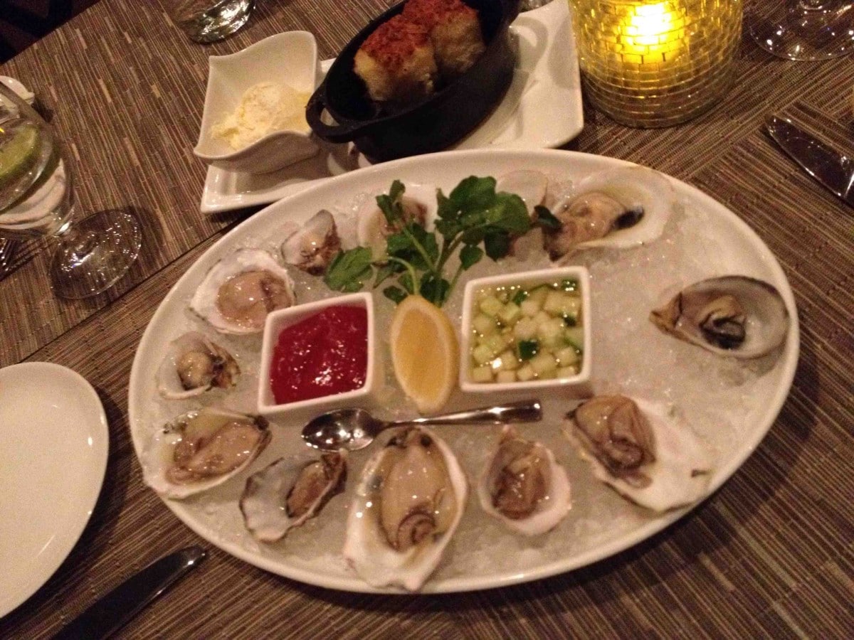My best friend and I took a quick trip on a super-rainy weekend and we were bummed there was no sun. However, our room was upgraded to a suite. We quite happily curled up and read books in front of the fireplace while it poured outside. Later, we headed downstairs for dinner at Sax—and this was quite possibly the best meal we ever had. Our server Mark brought out savory monkey bread (pull-apart Parmesan garlic bread) and Voss sparkling water. We enjoyed fresh East and West oysters and shrimp cocktail with sauce Marie rose.