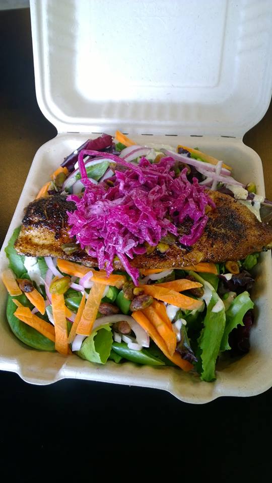 Andrea: One of my favorites is the “She was a Showgirl” vegetarian wrap with quinoa pilaf, basil pesto aioli, feta, spinach, red peppers … YUM. Another new thing we started doing is mushroom burgers. They are whole grilled portobello caps with several different choices of yummy toppings on a kaiser. A crowd favorite is the Mediterranean salad. It’s chicken, onion, capers and olives sautéed in white wine and lemon on a spinach, tomato and feta salad with a Grecian-esque dressing. Of course it’s also available with tofu!