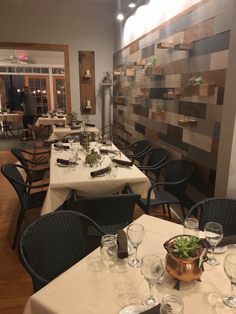 Along with Seth Cavallari of Brandywine Woodworks, she has installed a mixed wood wall, painted and assembled by hand, and a live-edge wood fireplace mantle, both of which are punctuated with succulents from TWIG Gardens, who also provided terrariums for each and every table. She chose minimal hairpin legged chairs, allowing the honey-colored wood floors of the main dining room to flow underneath and a muted yet ornate damask wallpaper to accent the fireplace, which contrasts perfectly with the rustic slate floors in the back dining room. Strung bulb lights suspended above the outdoor patio give it a magical feel as it awaits warm weather use.