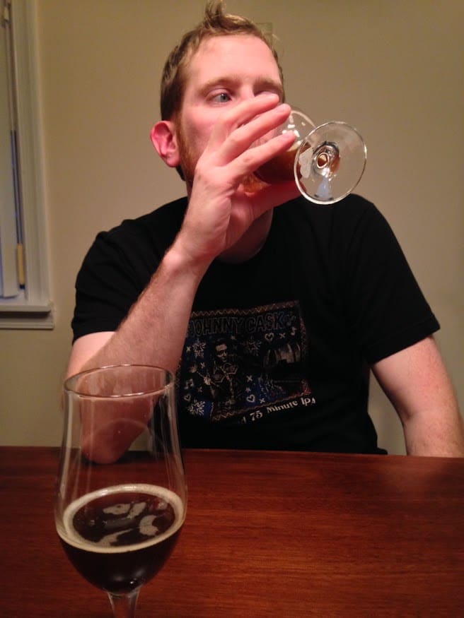 To assist me in this blind tasting I enlisted my beer-geek brother, Tofer. First we poured each brew into a tulip glass. Each one was a dark mahogany brown with a slightly cloudy appearance. The Westvleteren 12 had slightly more head, but all in all they appeared similar.