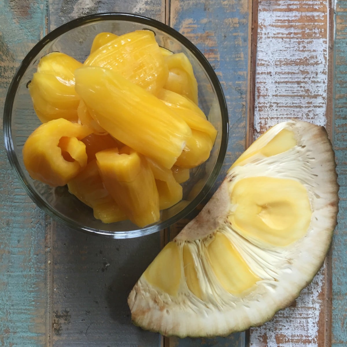 When you cut a jackfruit in half, you will find multiple fruit lobes (bulbs) and gigantic seeds (the size of an olive) that are wedged in seed pods. The yellow lobes are the only edible parts and they are also very sticky (gloves might help when working with it).