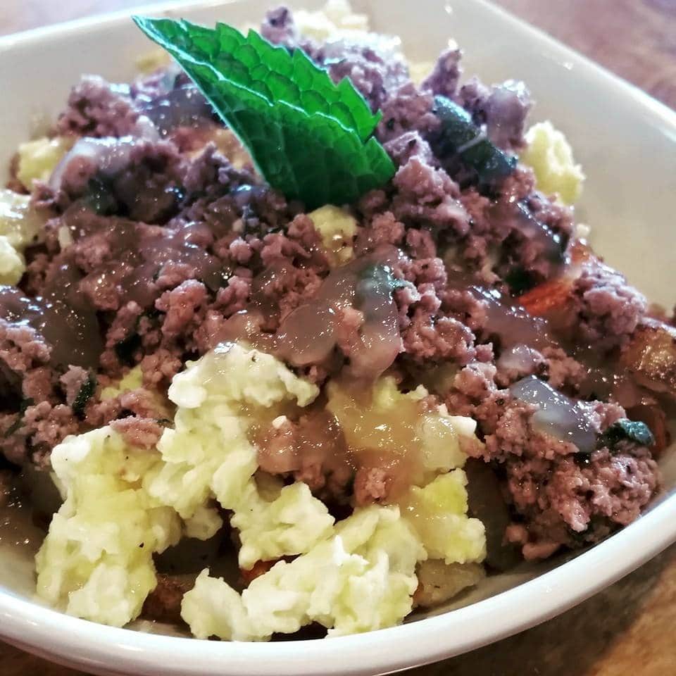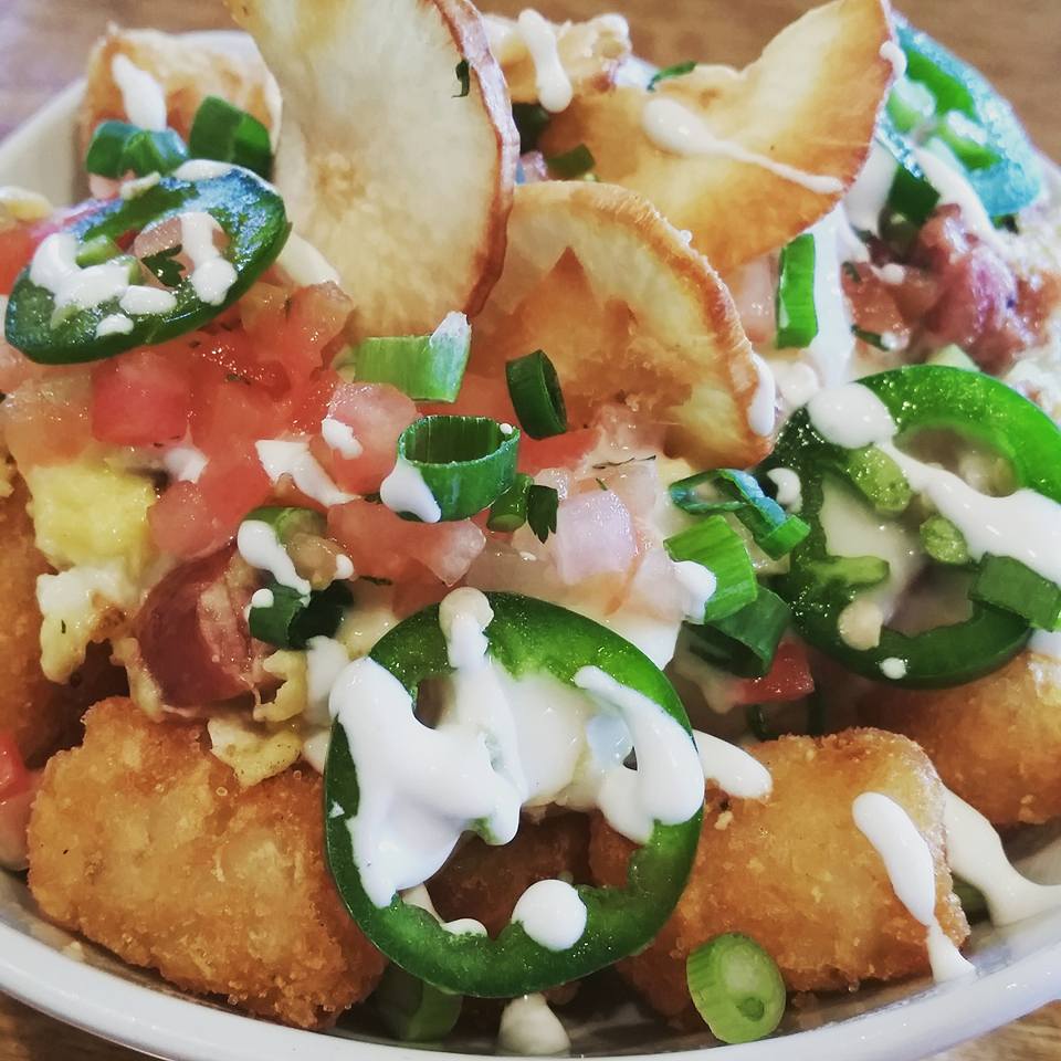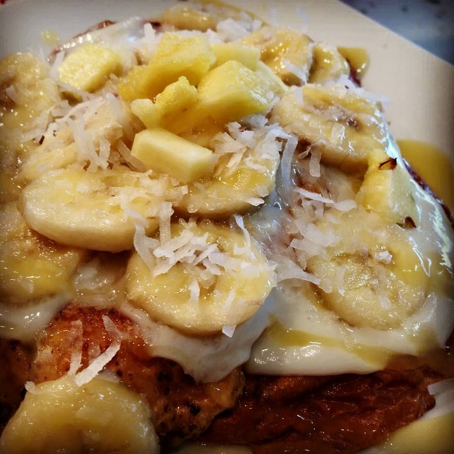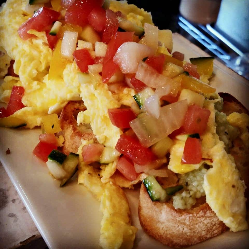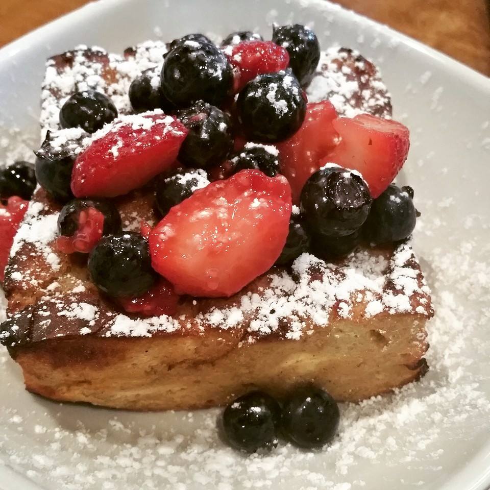 The People’s Kitchen prides itself on a balanced breakfast menu of old and new. Patrons of traditional diner fare will be happy to find dishes like the Hen & Hog: eggs your style, choice of meat, breakfast potatoes and toast, and Buckwheat Pancakes, served in a two-, four- or six-stack. Those looking for something a little less traditional and a little more creative for breakfast will enjoy dishes like the extremely popular croissant French toast topped with bourbon-laced bananas. There’s also the full Monte, a very cool twist on a Monte Cristo: a large multigrain ciabatta roll stuffed with egg, smoked gouda, turkey bacon, dusted with powdered sugar and accompanied by a side of homemade berry compote. We highly recommend asking about the homemade bread options; our favorite is the vegan onion dill bread with a side of homemade jam, made by a friend and frequent diner. The cafe usually has two jam options daily; all are delicious when slathered on any of the housemade breads.