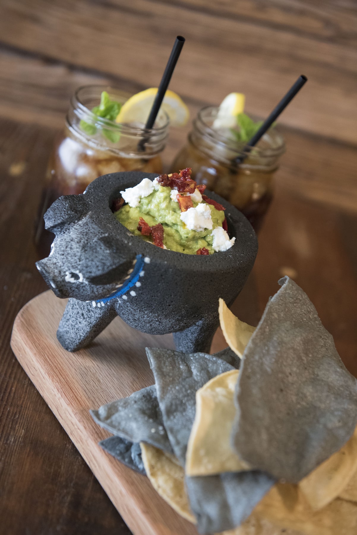 The Mediterranean-themed seasonal menu throws captivating Mexican and American curves with a full-flavored house-made guacamole mixed with chunks of oven-roasted tomatoes and dollops of goat cheese served with stacked oversize tortilla chips. The flatbread starter topped with chihuahua cheese, black beans, queso fresco, pico de gallo, tomatillo salsa and cilantro takes authentic carnitas up a notch. Many of the herbs, veggies and delicate micro green embellishments are grown at Tina’s own Rogue Fox Farm in Oxford.