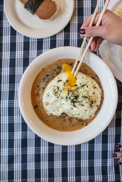Hawaiian local food, as Aranita details, “is based on the blend of food that came about once people started immigrating to the islands to work on the sugarcane plantations, including a lot of my ancestors … people came from the Philippines, from China, from Japan, from Okinawa, and eventually Korea and Portugal and Puerto Rico. They came from all over. All these people came together and contributed dishes that are easily served with two scoops of rice and one scoop of macaroni salad.”