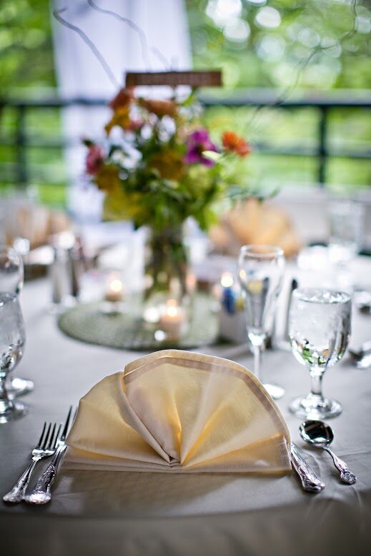 Included in your arrangements are ivory linens complemented by ultra-white outdoor chairs. The Desmond will enhance the table with mirrored tiles and votive candles.